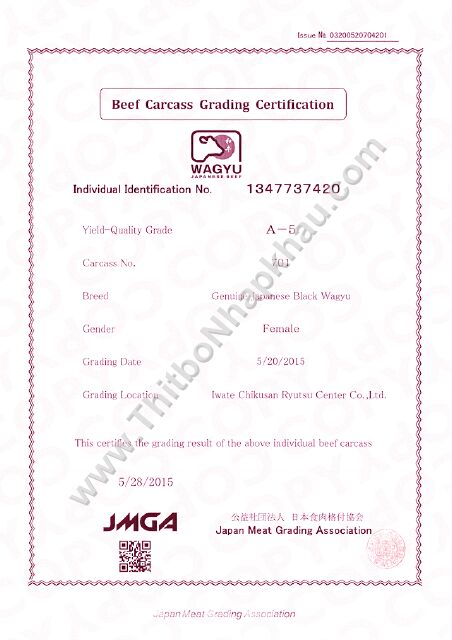 GIẤY CHỨNG NHẬN XUẤT XỨ CỦA BÒ NHẬT